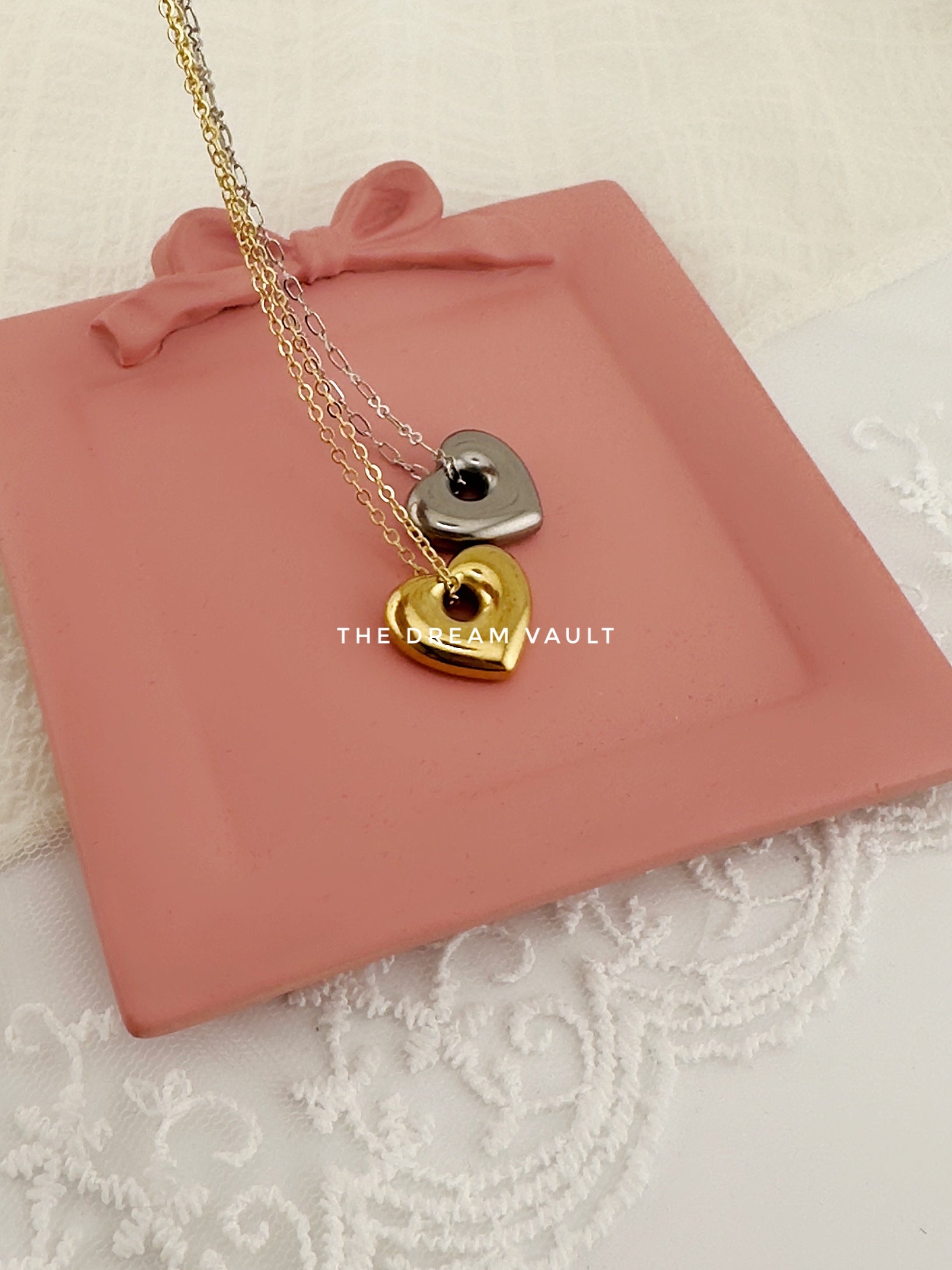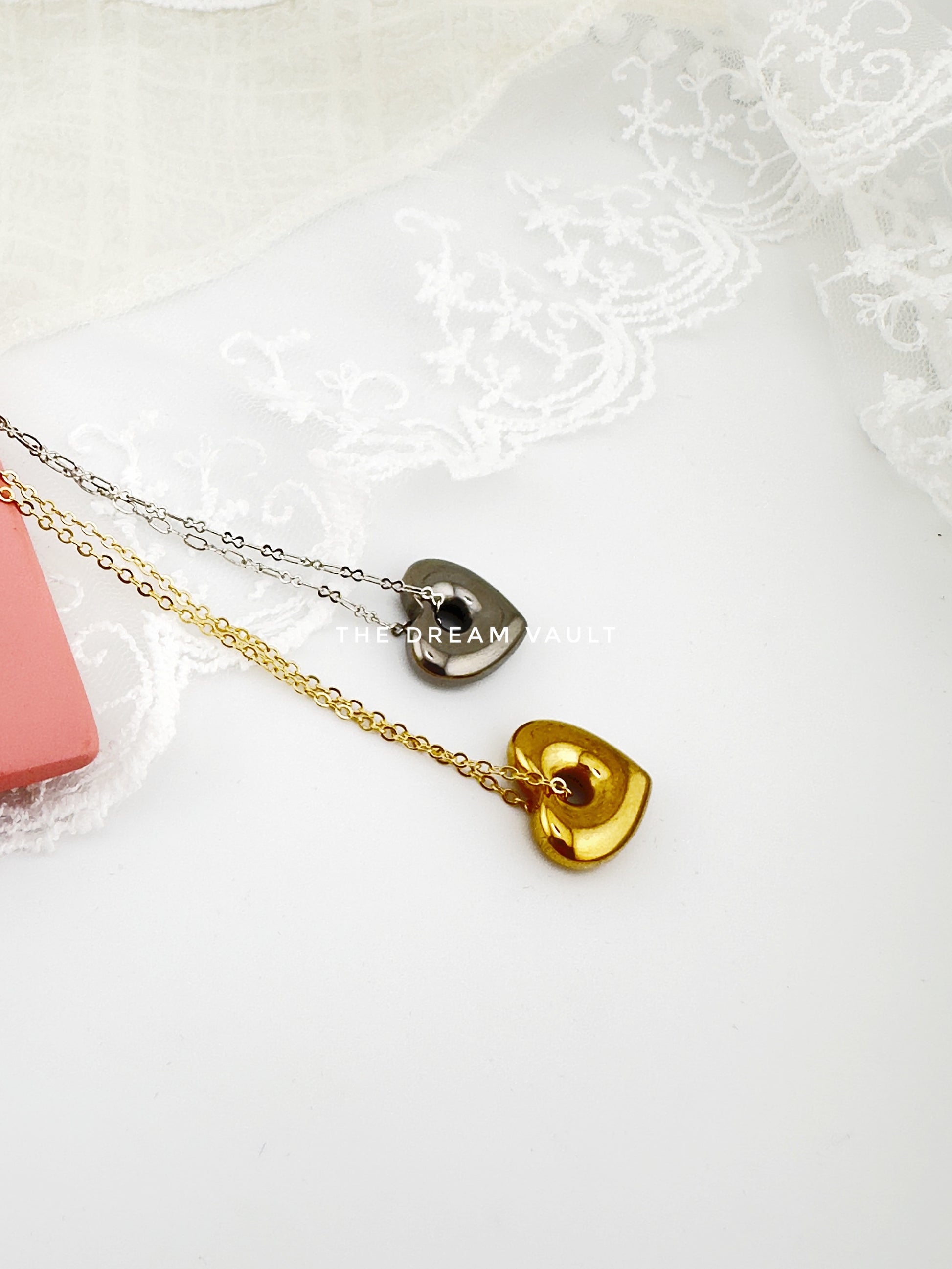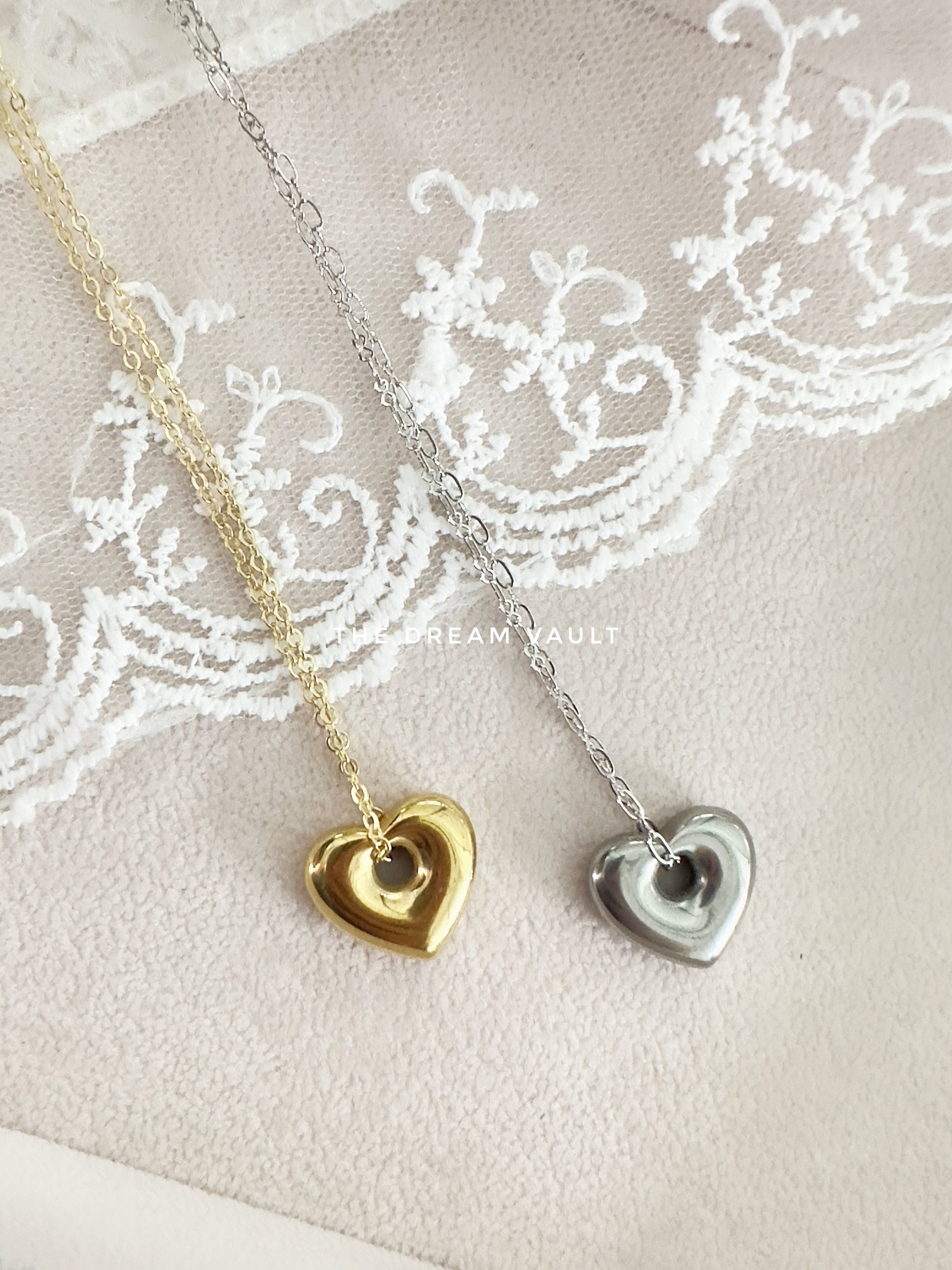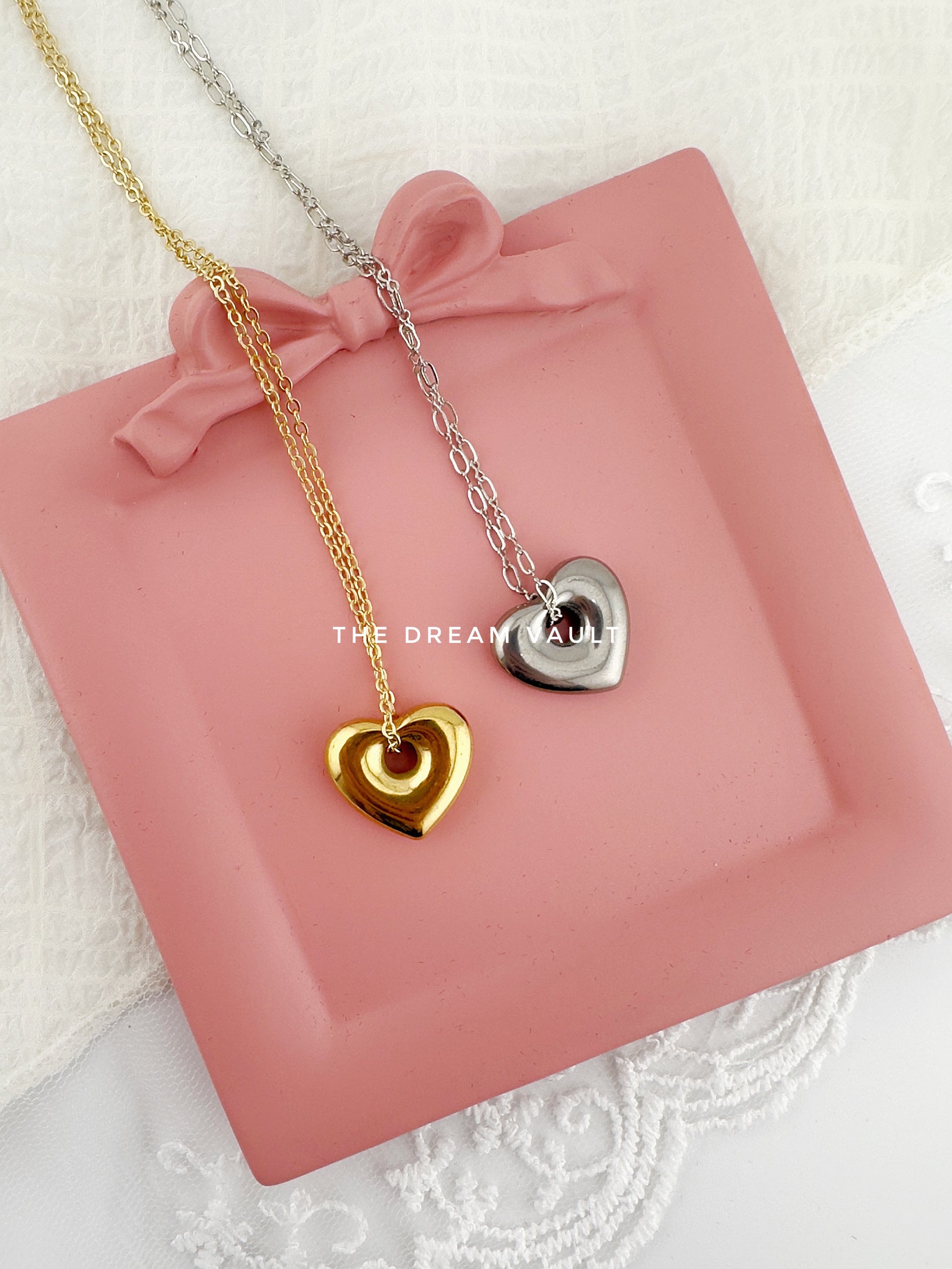 Minimalist and chic, these gold and silver necklaces each features a single, sleek heart pendant on the delicate classic chains.