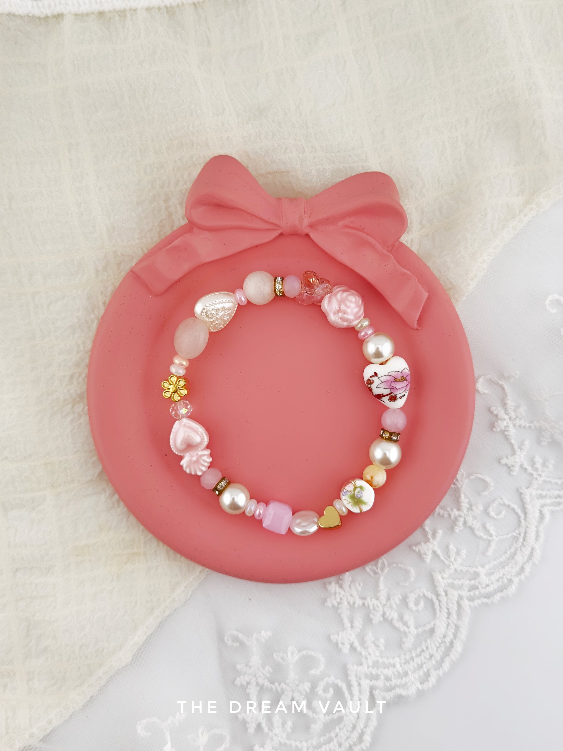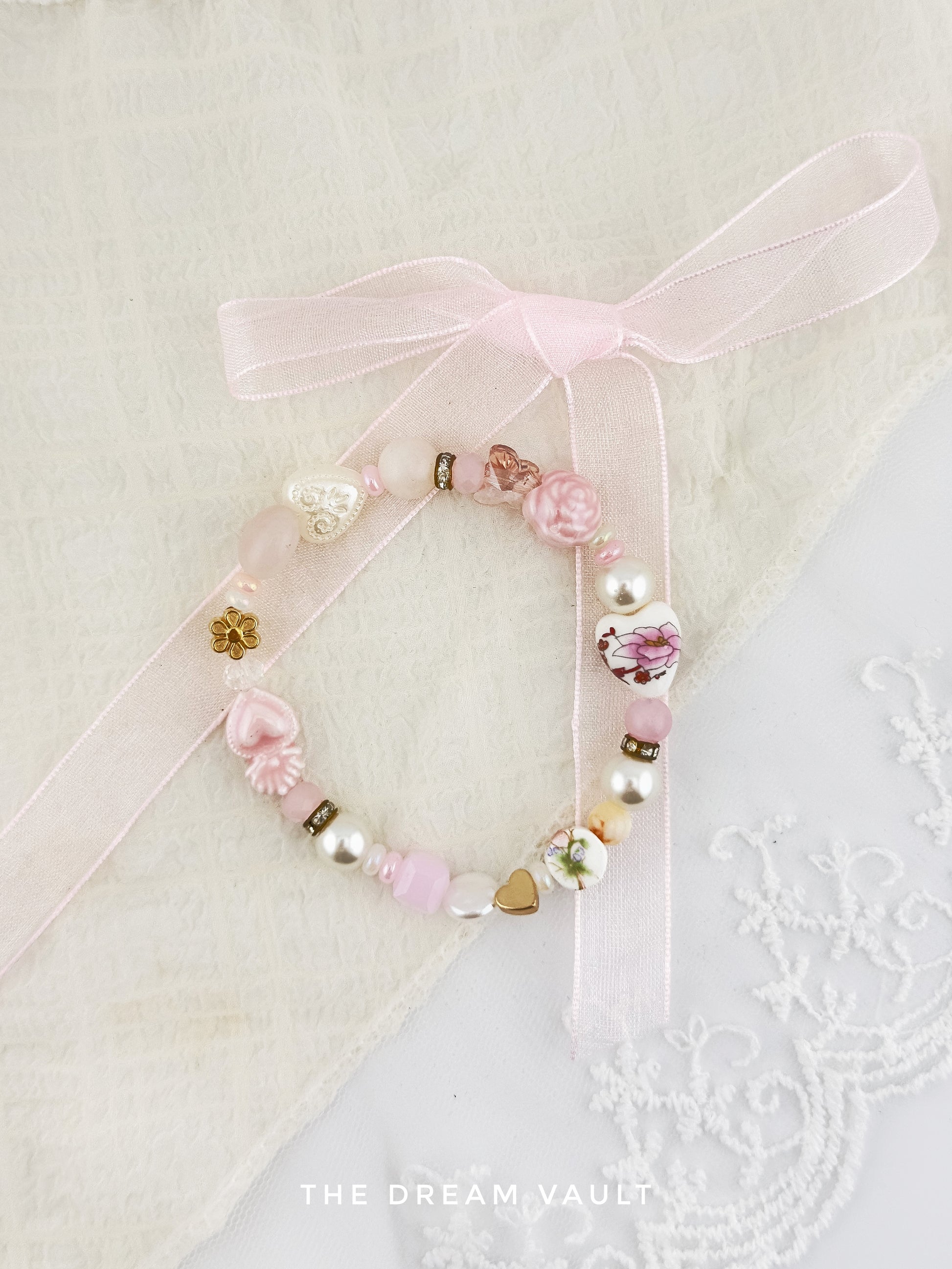 This enchanting bracelet combines the gentle energies of Rose Quartz and Moonstone with the delicate beauty of a floral ceramic charm.