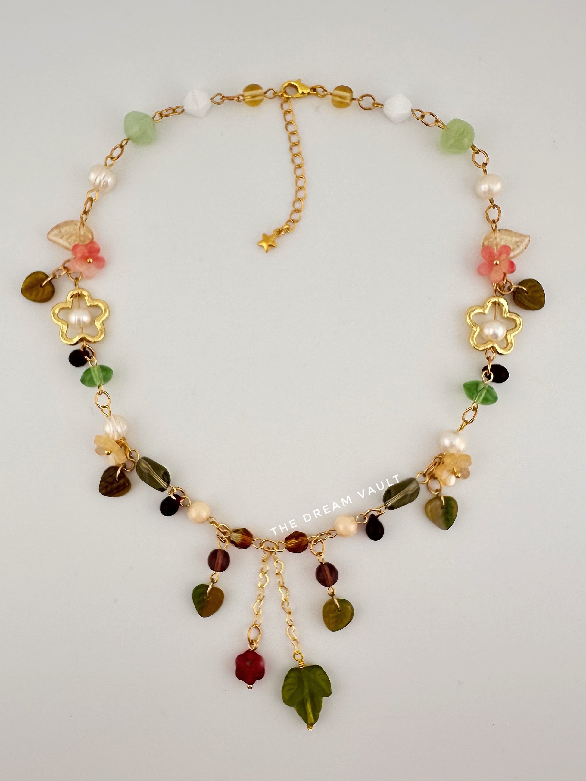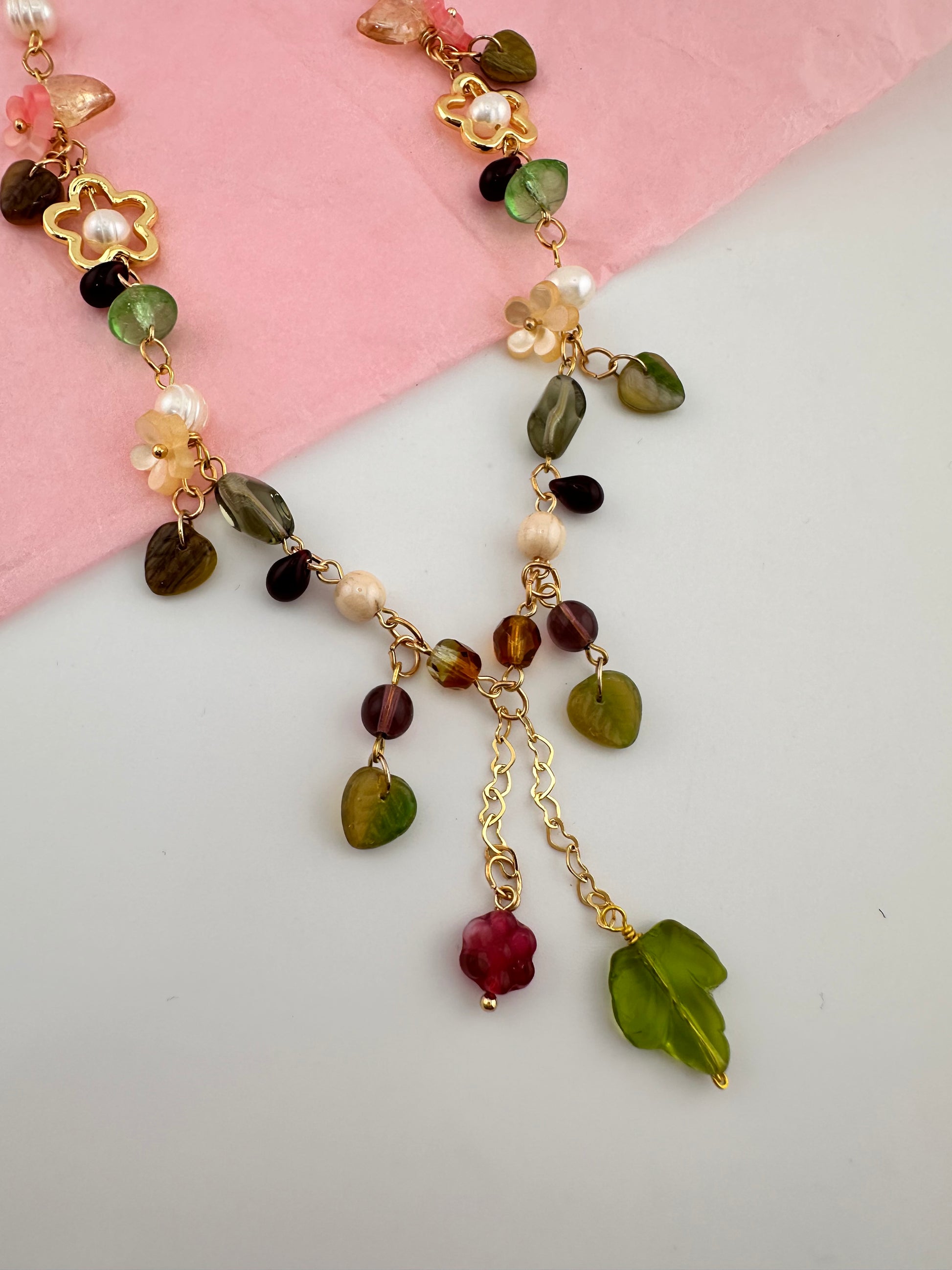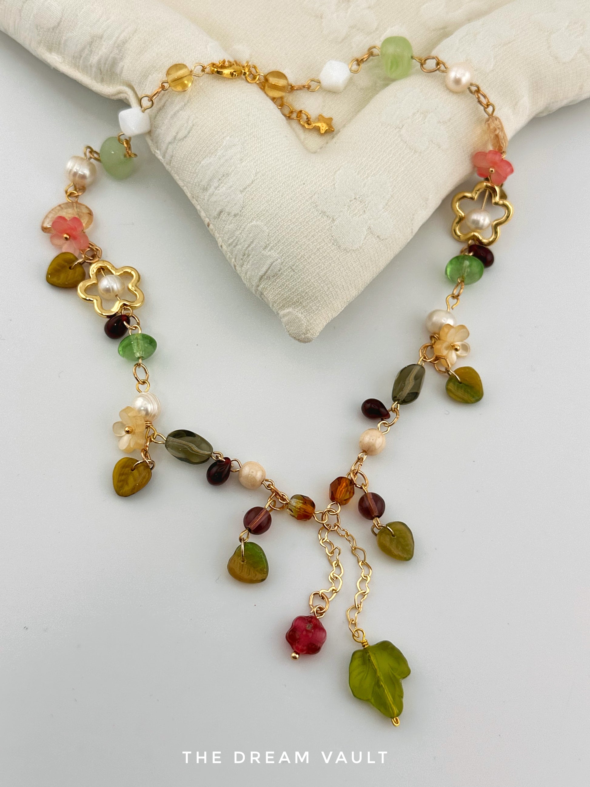 Step into a whimsical garden with this charming necklace, crafted with a durable gold-plated stainless steel chain. It features a delightful array of vintage glass beads in soft greens, delicate pinks, and earthy tones, alongside lustrous freshwater pearls. Gold-plated flower charms with pearl centers and green glass leaves complete this enchanting, nature-inspired piece.