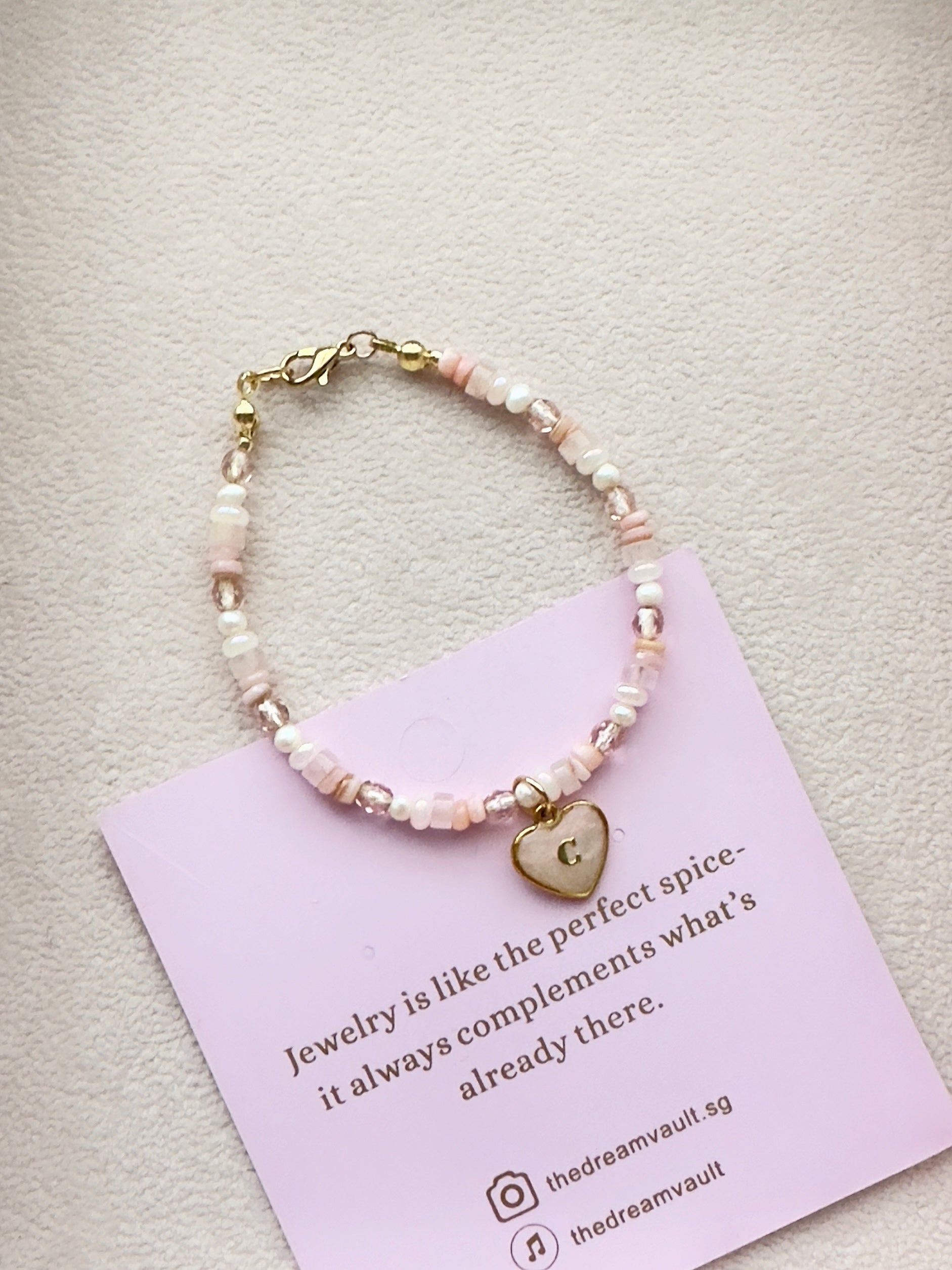 Sweet and delicate bracelet with a romantic feel. The soft pink hues of the opal and rose quartz crystals are complemented by a dainty gold heart charm, making it a perfect everyday piece.