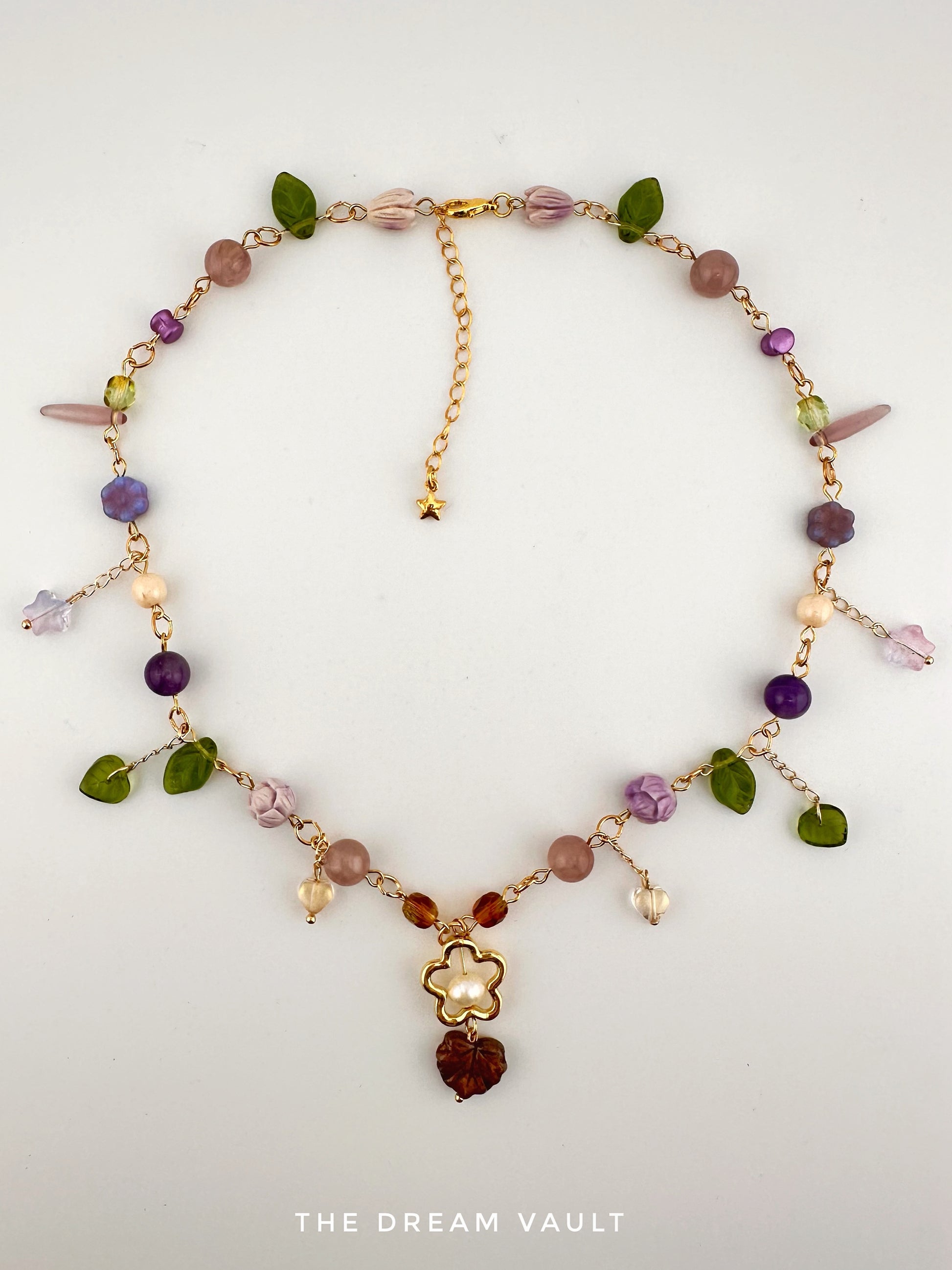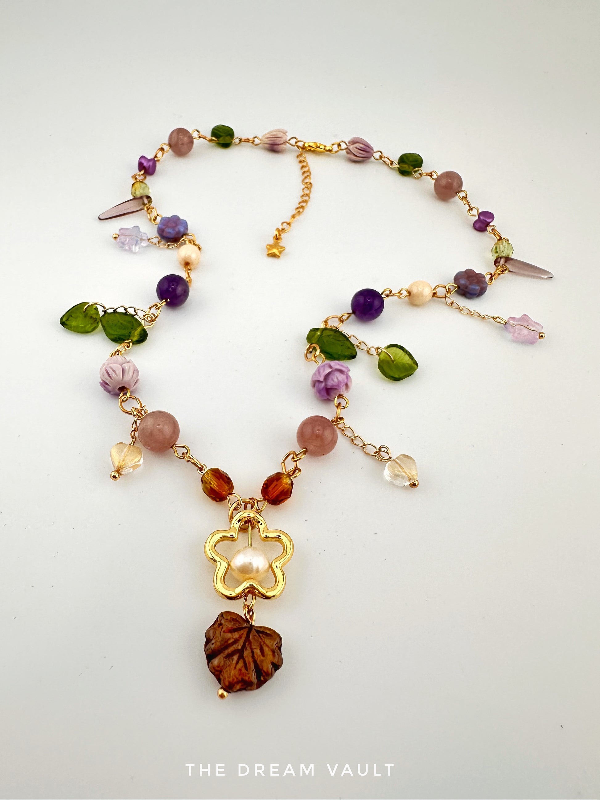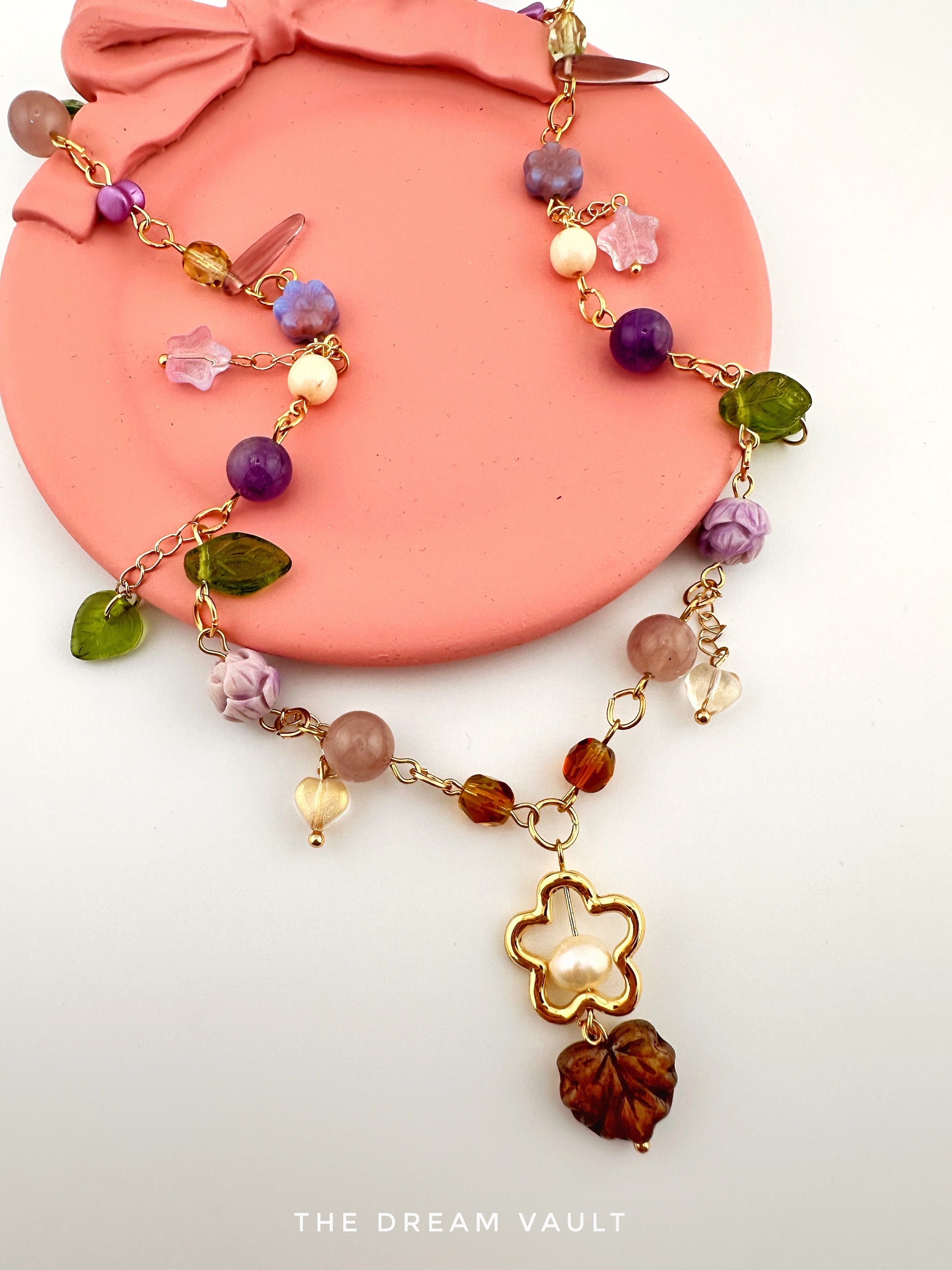 A delightful blend of whimsy and nature, this necklace features a gold-plated stainless steel chain adorned with an array of vintage glass beads in soft lavenders, rich amethysts, and earthy greens. A unique carved leaf charm and a delicate freshwater pearl nestled within a gold-plated flower pendant complete this enchanting piece.