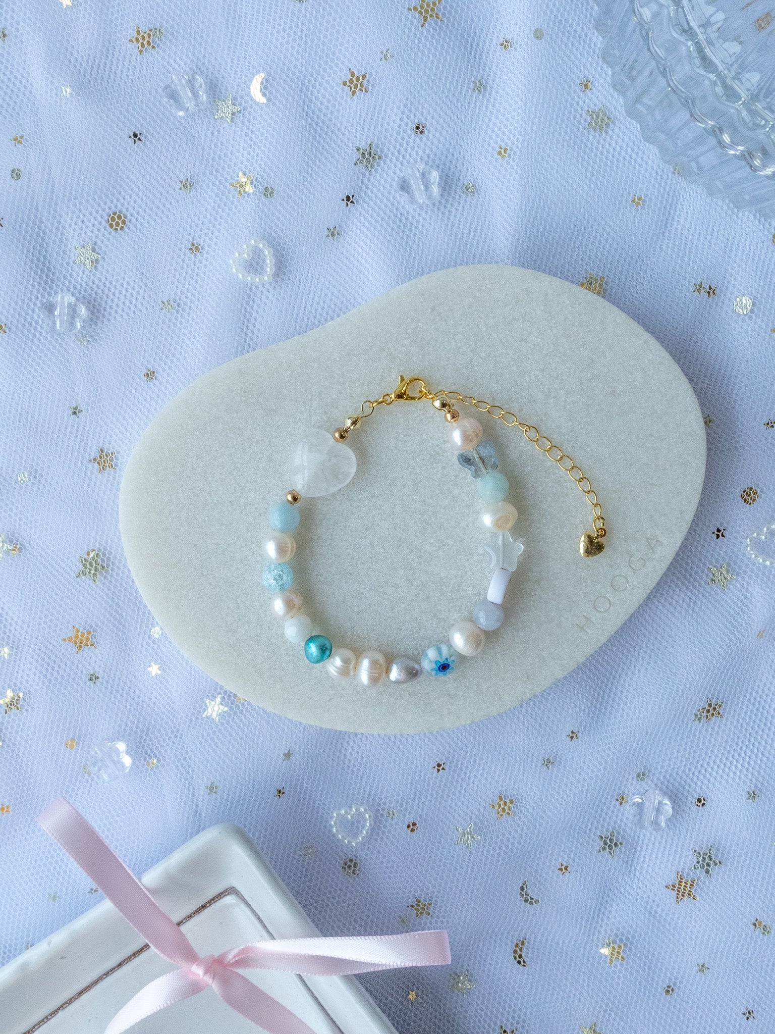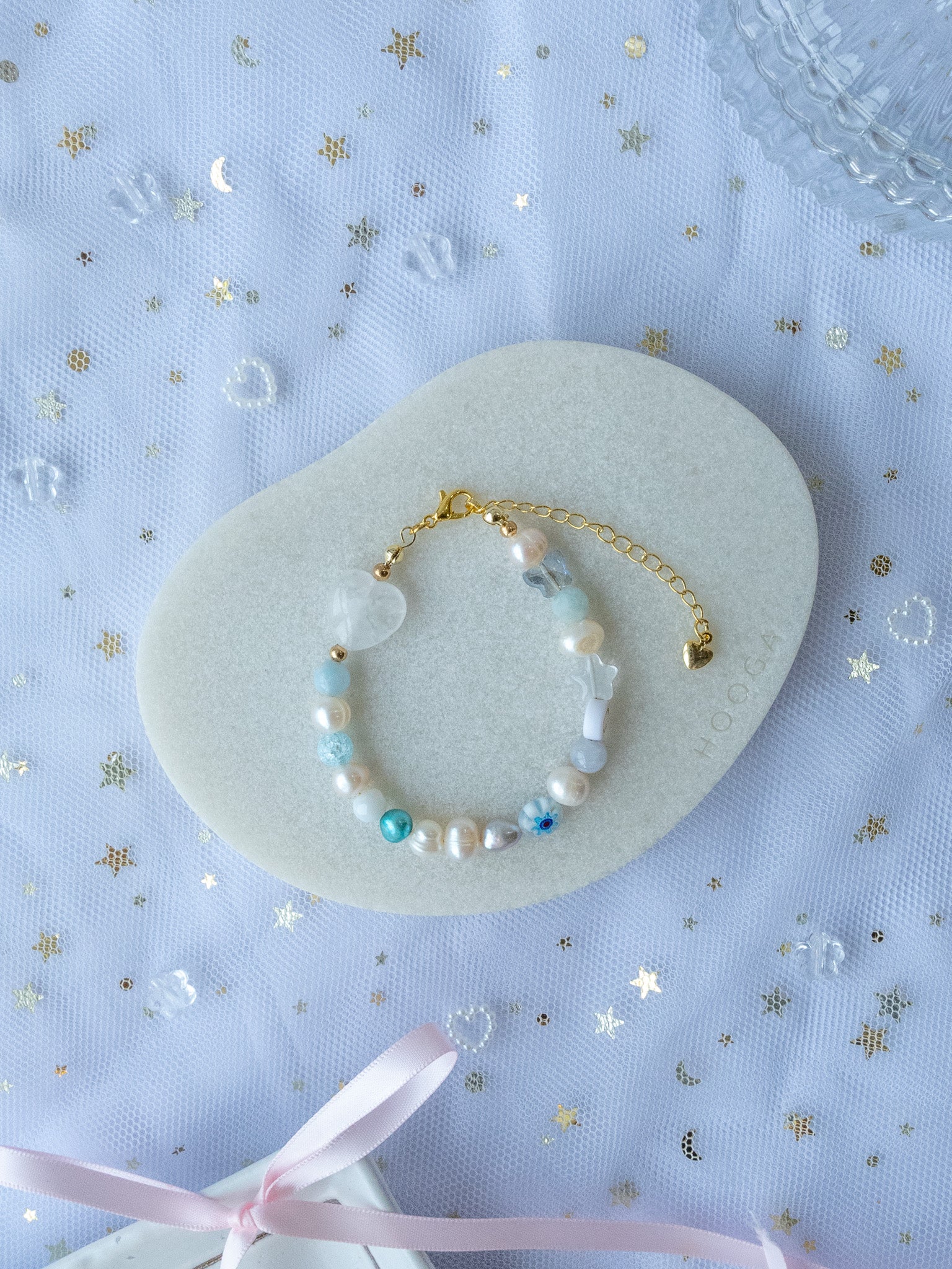Lumina picked up the bracelet, its delicate weight a comforting presence in her hand. The smooth, cool pearls felt like tiny moons against her skin, interspersed with the soft blue of fLorax buttons, each one a miniature sky. It was a piece that whispered of tranquility, of quiet moments under a starlit sky.