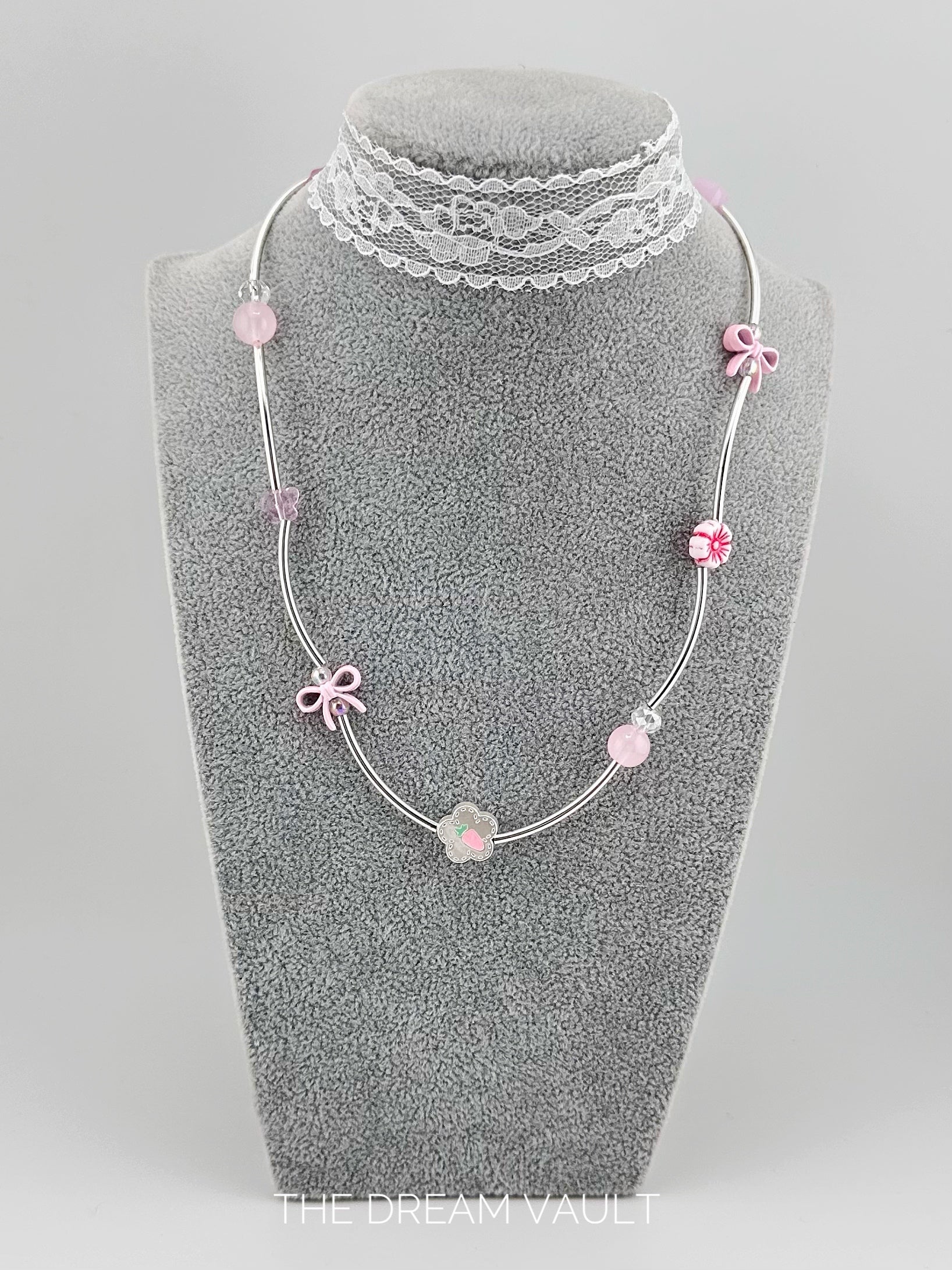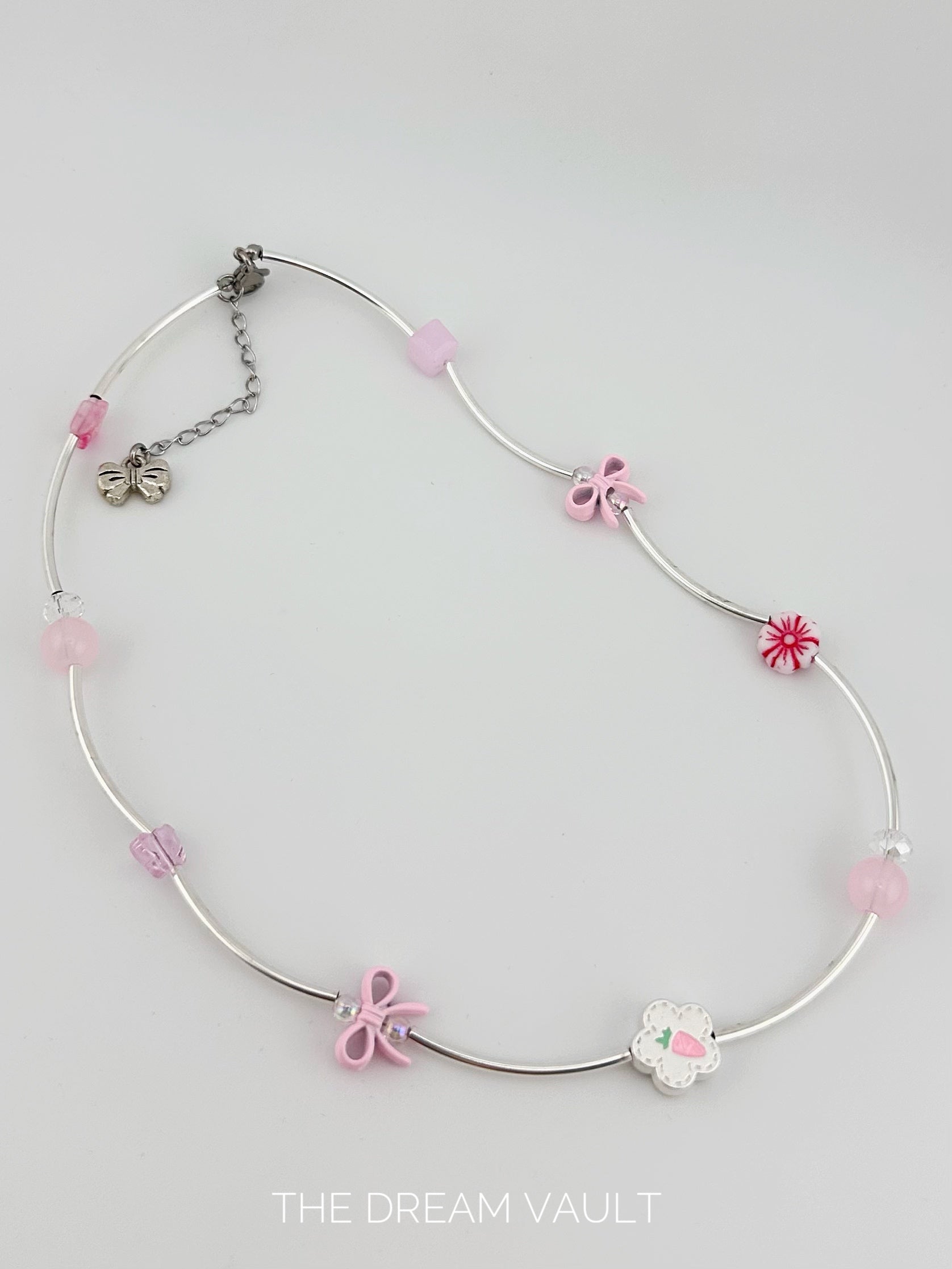 This charming necklace features a delicate string of polished stainless steel tubes, interspersed with various whimsical elements. Adorning the necklace are several sweet pink enamel bows, along with small white and pink flowers, one of which appears to have a delightful strawberry detail. Clear and frosted glass beads in soft pink hues add a touch of sparkle and translucence. The necklace is secured with a small, elegant extension chain and clasp at the back, which is adorned with a tiny ribbon charm, contributing to its overall dainty and playful aesthetic.