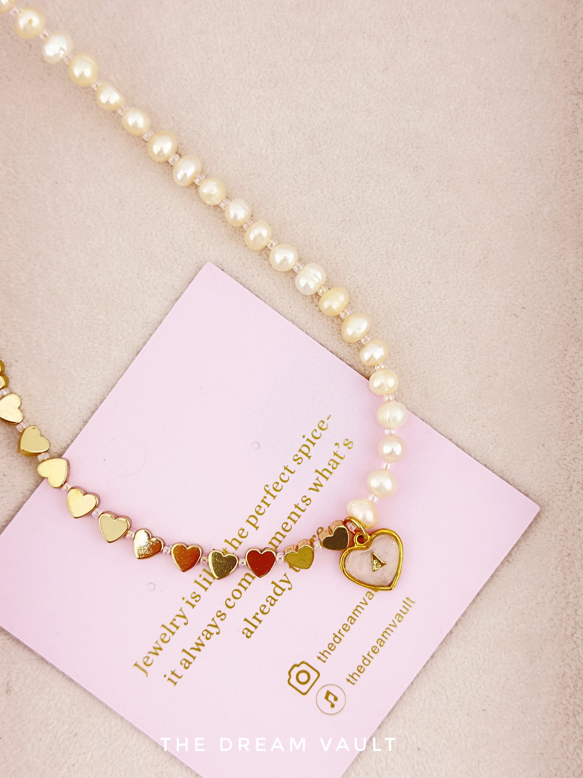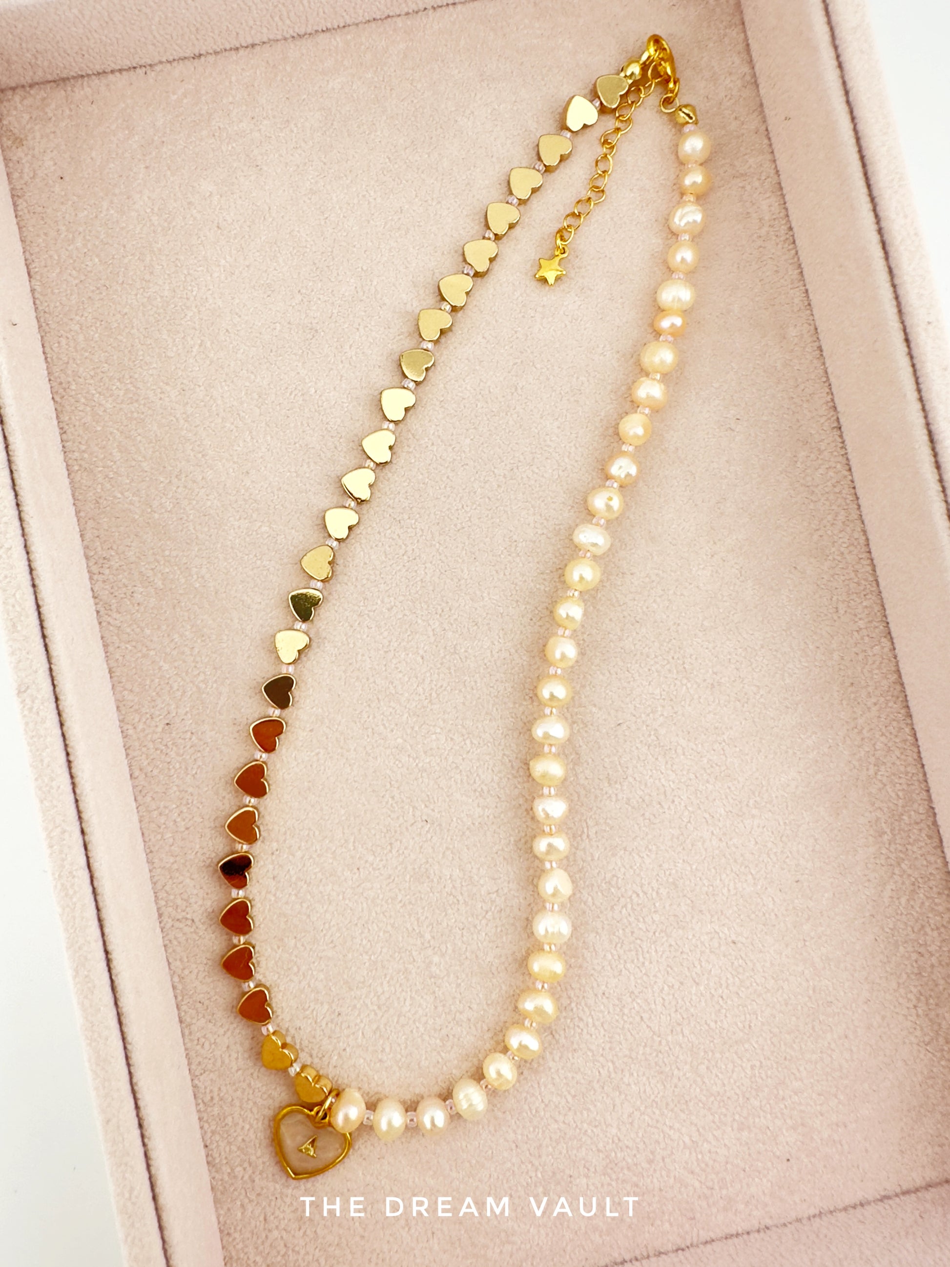 A delicate string of freshwater pearls, each one a tiny, luminous dream, flowed into a cascade of golden hearts.