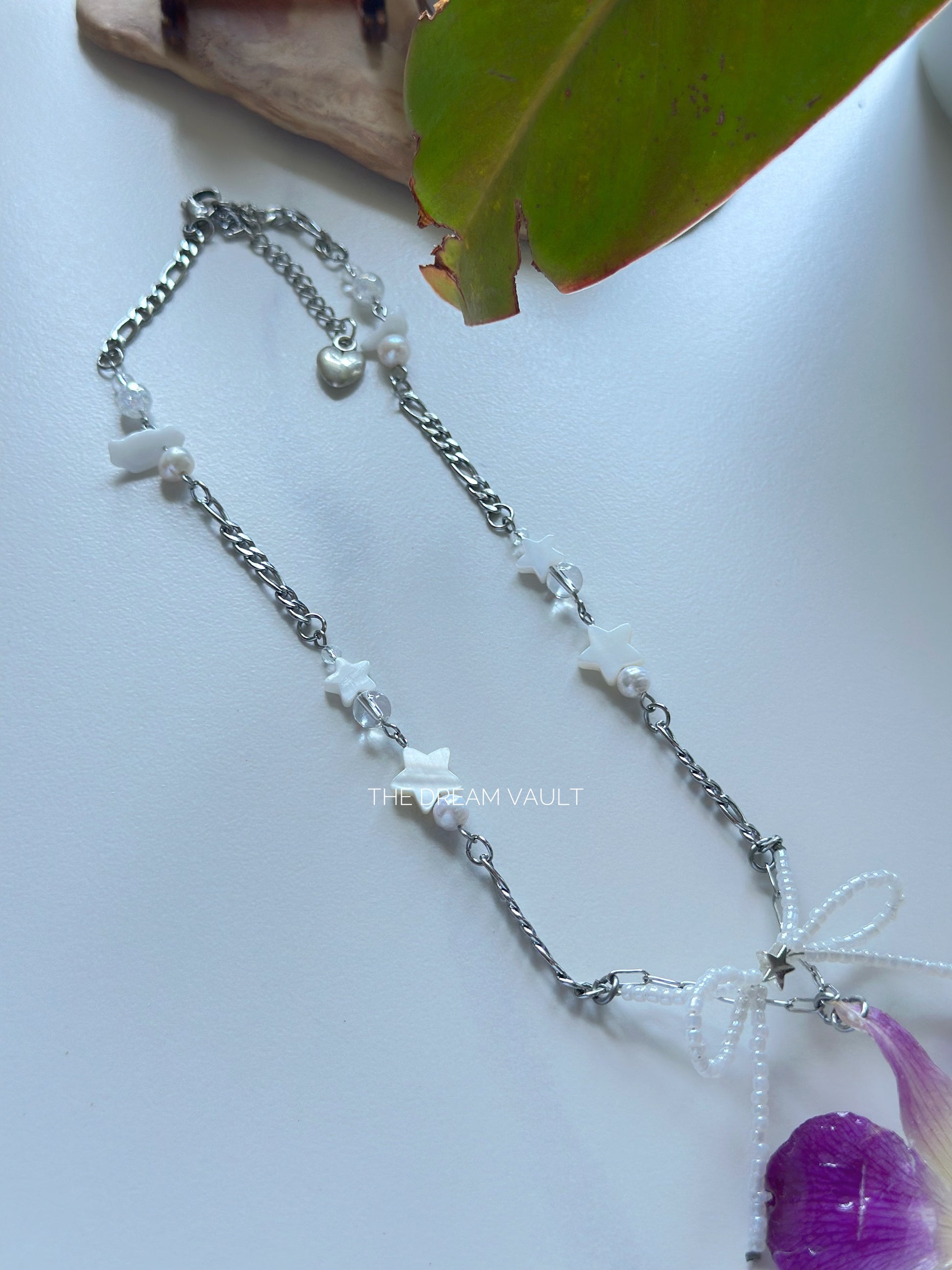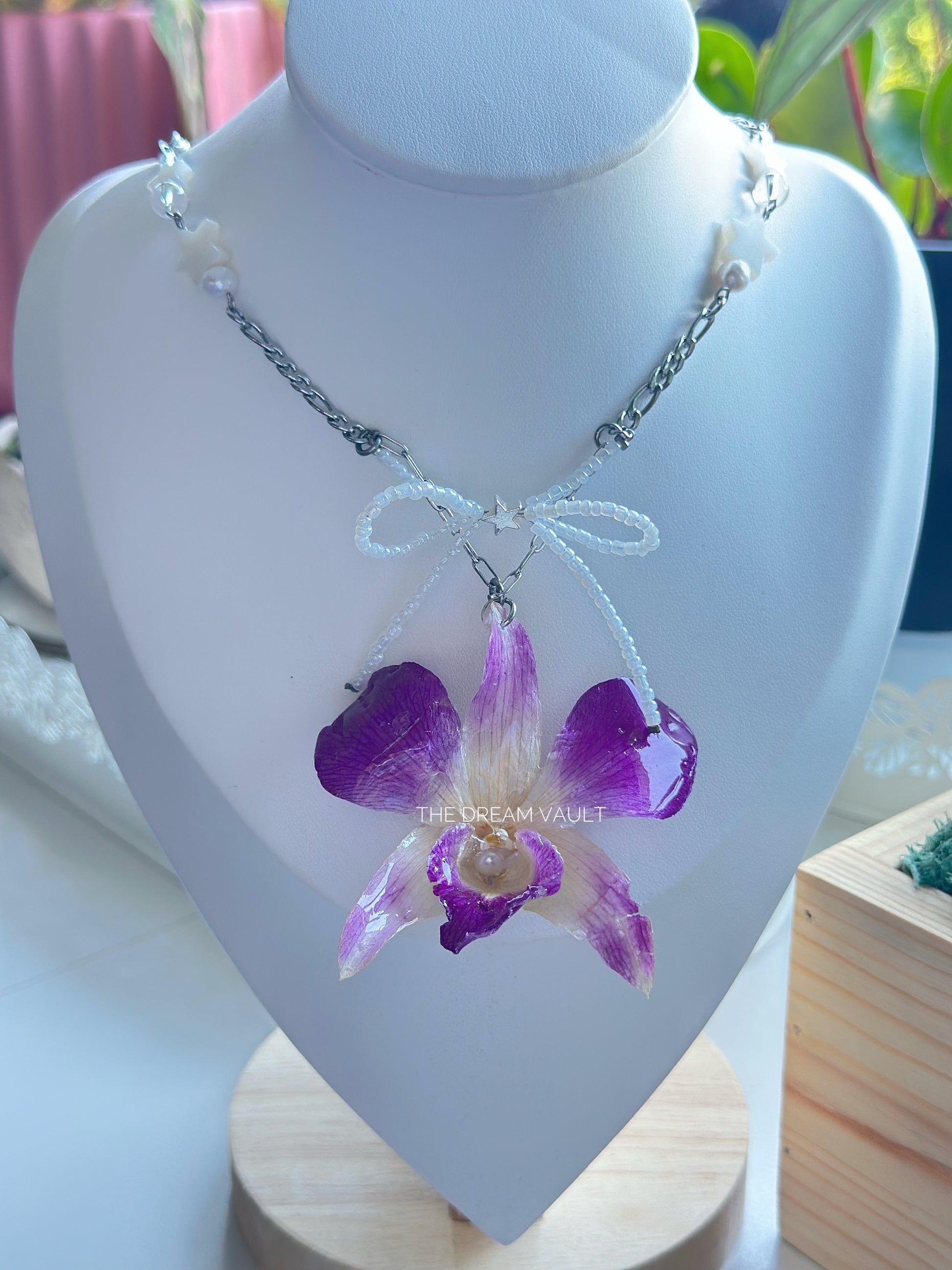 A stunning statement from nature. This necklace features a real purple orchid, expertly preserved in resin to maintain its intricate details. Adorned with a delicate chain and subtle white accents, it's a captivating piece that brings the serenity and beauty of the natural world to your everyday style.
