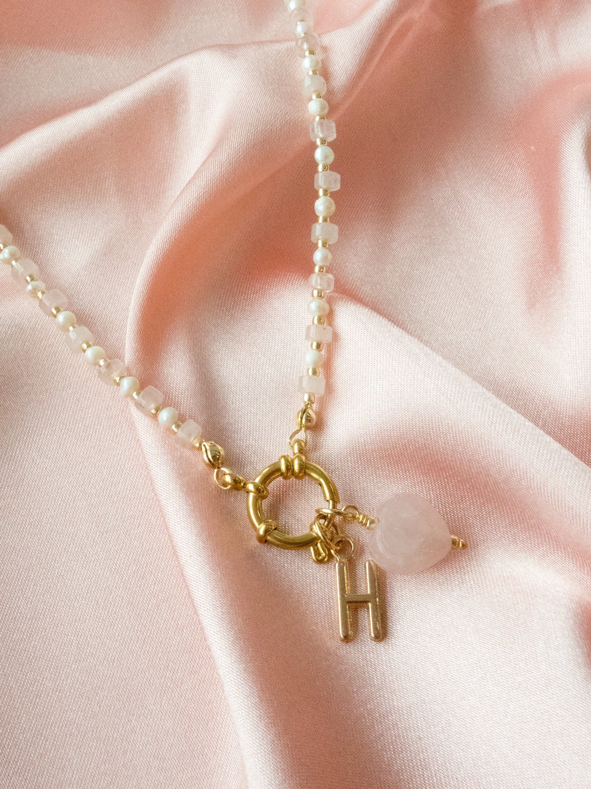 This piece features a delicate chain adorned with these beautiful elements, culminating in a personalized touch with custom initials and a charming rose quartz heart pendant, making it a meaningful and stylish accessory.