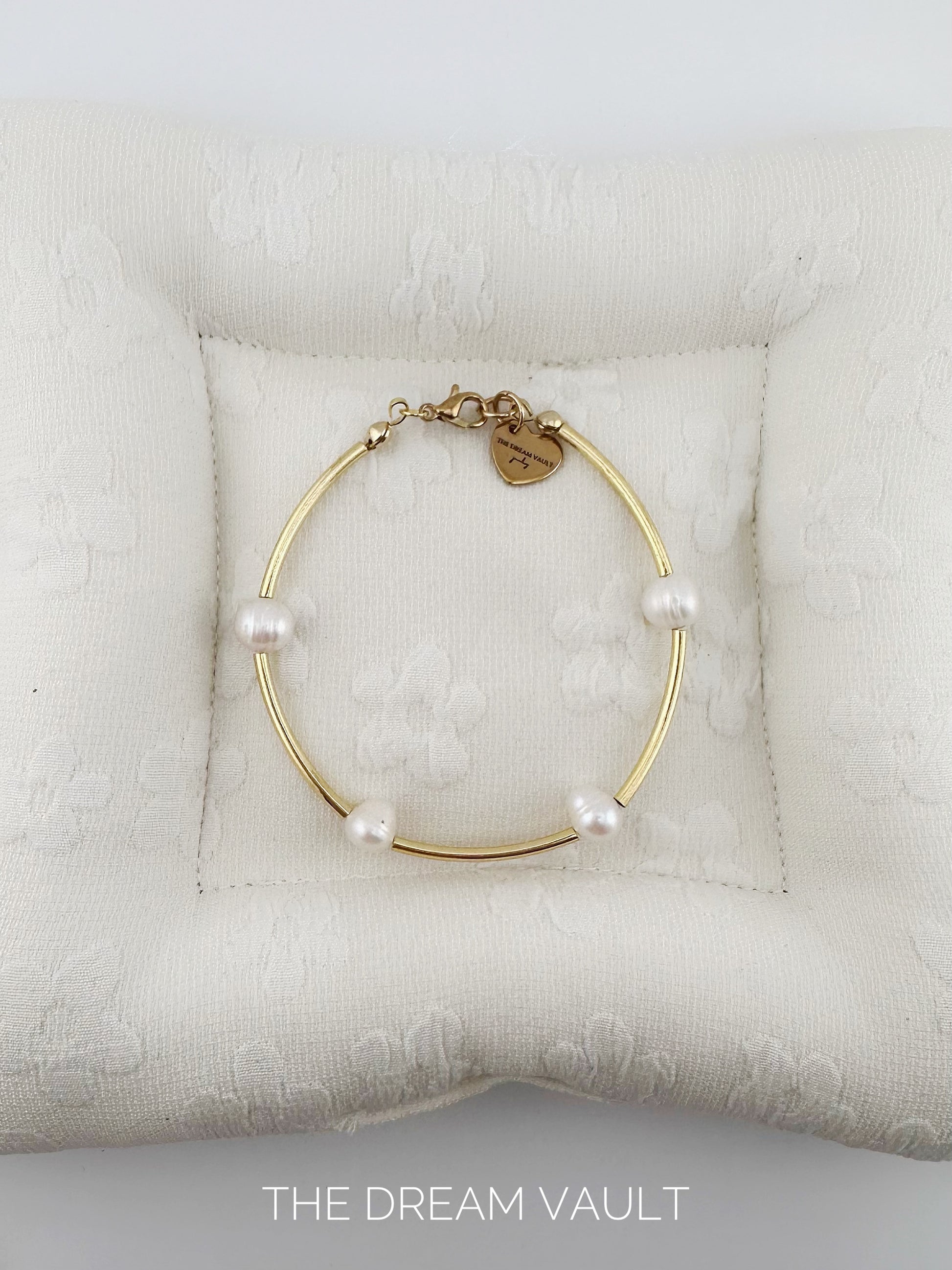 This is an elegant bracelet featuring a smooth, curved stainless steel bar that subtly showcases four lustrous, natural freshwater pearls. It's designed with a minimalist aesthetic, offering a timeless and versatile accessory that adds a touch of sophistication to any wrist.